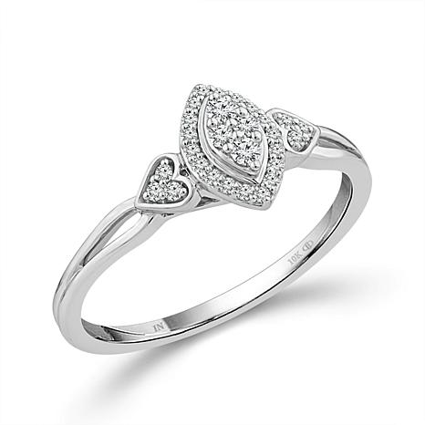 A marquise-inspired center design and heart motifs along the sides give this diamond fashion ring a romantic flair, while the open shoulders add a modern touch. Set in gleaming 10K white gold, twenty-eight round diamonds catch the light beautifully for a look that transitions effortlessly from day to evening.