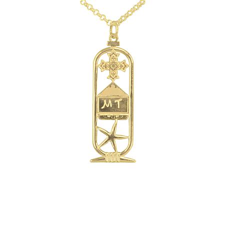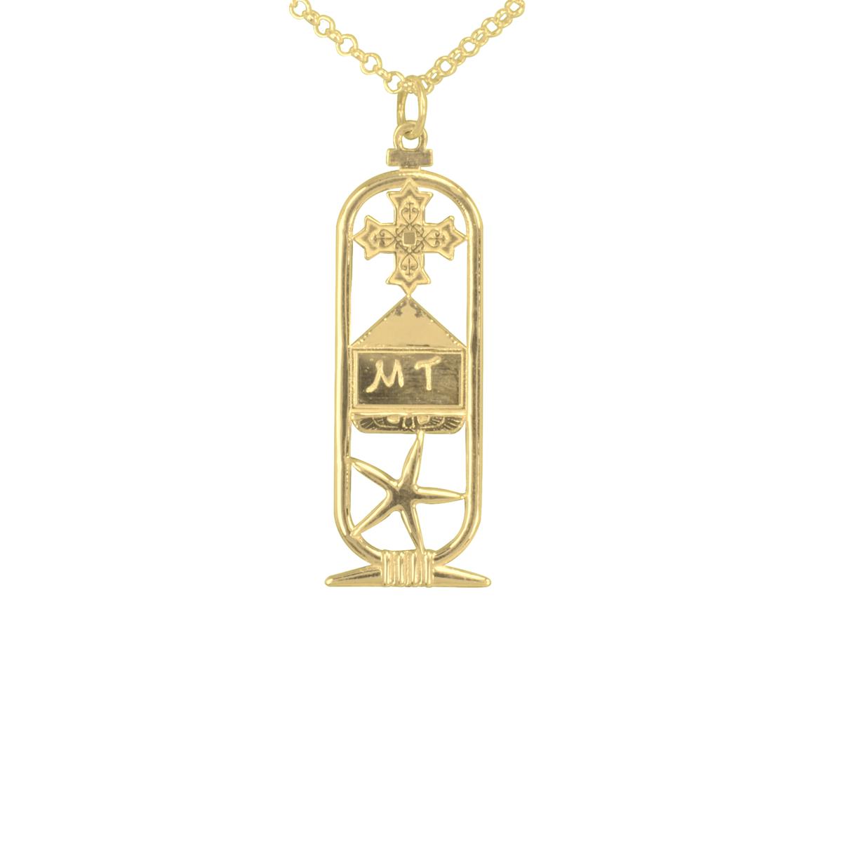 Give a unique spiritual gift to someone special with this personalized cartouche necklace. The top symbol is the Coptic Cross, representing the love of God. The lower symbol is Seba, which represents the stars, time, travel and new beginnings. Personalize this detailed piece with your selection of 1 or 2 English letters to be placed in the middle.