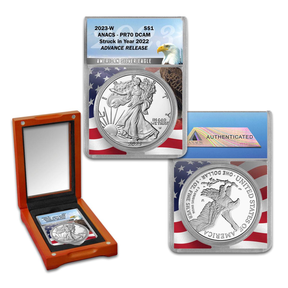 - 2023 PR70 DCAM ANACS Advance Release Silver Eagle dollar coin struck in 2022