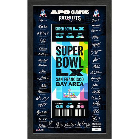 Celebrate the thrilling victory of the 2025-26 NFL AFC Champions with this stunning framed display. Perfect for any football fan, it showcases a custom print of the Super Bowl LX commemorative ticket surrounded by replica signatures of the championship roster. This limited edition piece is ready to shine in your home or office, adding a touch of sports history to your collection.