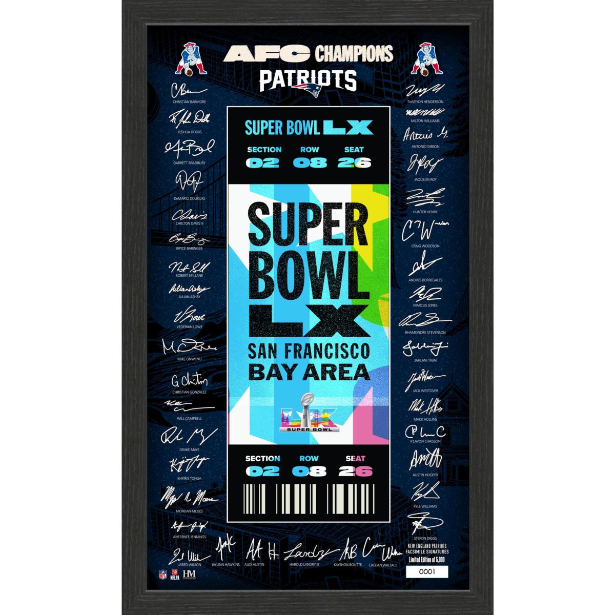 - 10" x 18" custom print featuring the Super Bowl LX commemorative ticket and facsimile signatures