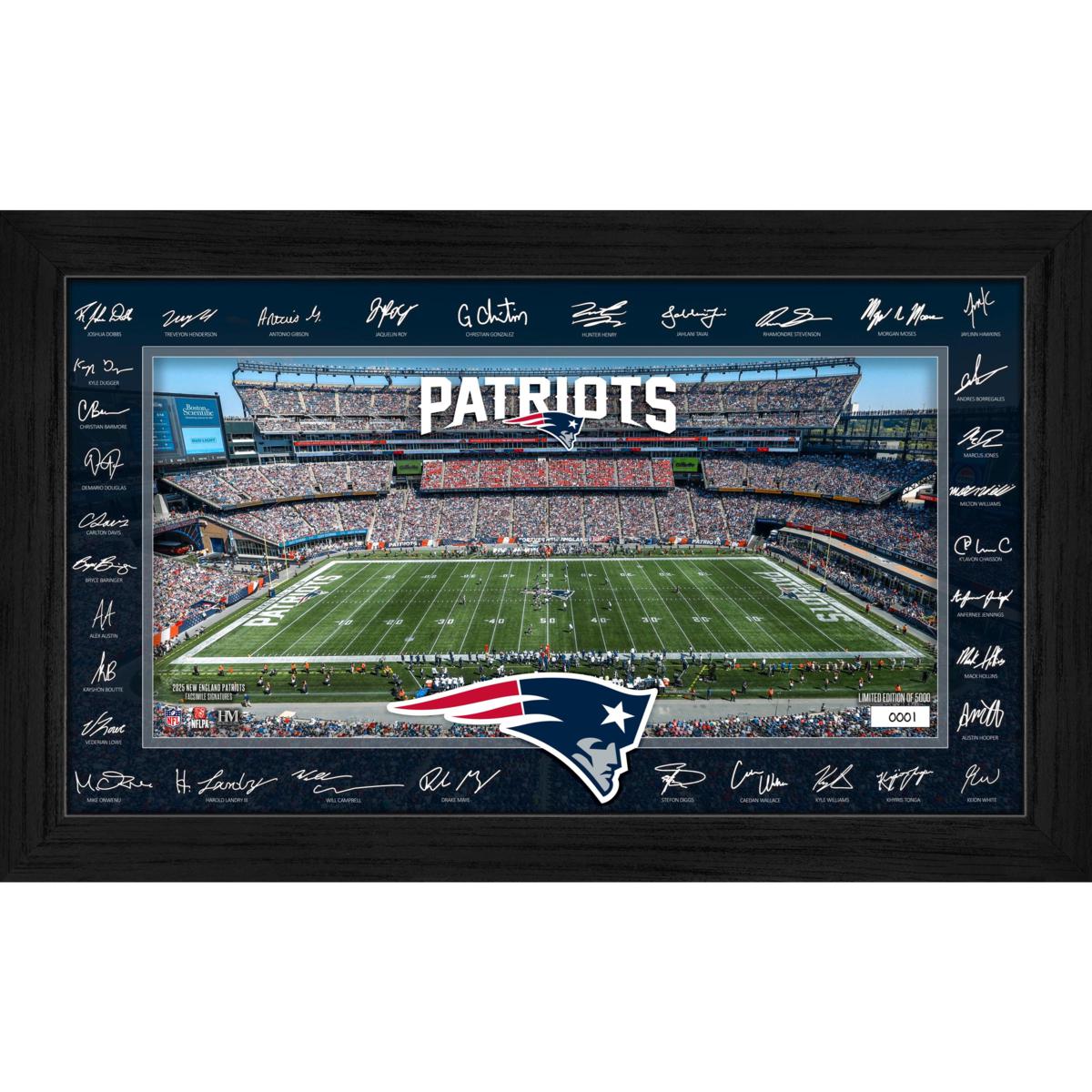 Display your fandom in style with this 12" x 20" Signature Gridiron frame, showcasing an individually hand-numbered print of your favorite team's home field and surrounded by the facsimile (replica) signatures of most of the 2025 team roster. Elegantly presented under acrylic glass, this officially licensed collectible is a limited edition of 5,000 (and accompanied by a certificate of authenticity).
