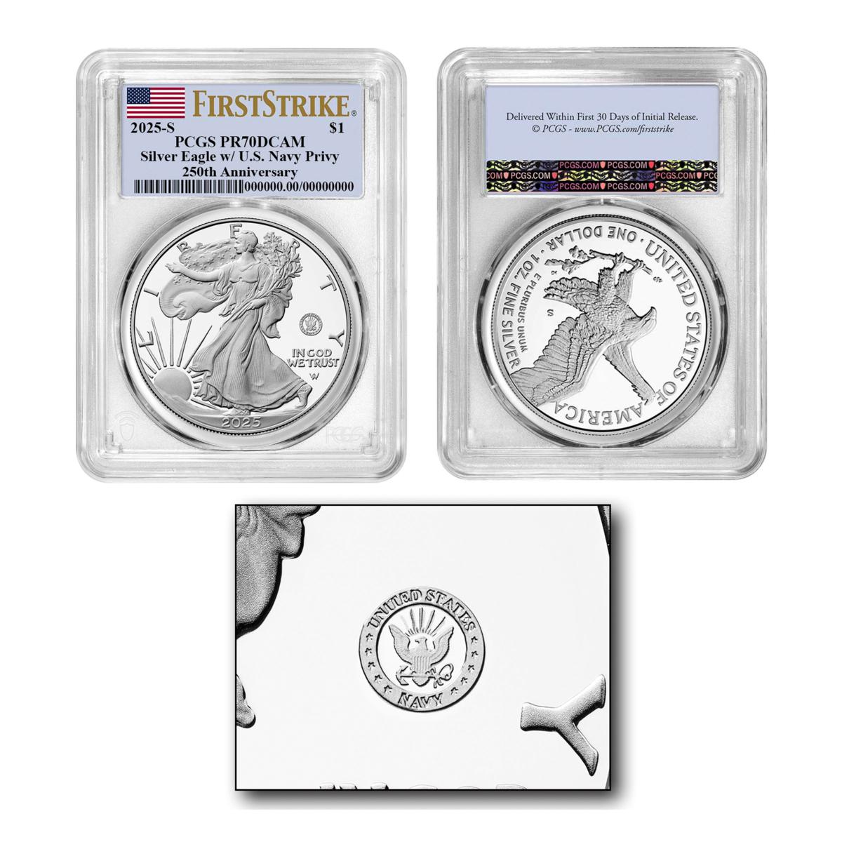- 2025 Silver Eagle Navy Privy Mark graded PCGS PR70 First Strike