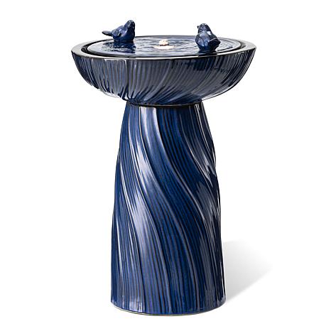 This chic and interesting ceramic fountain featured with delicate embossed twist texture and two cute lively birds, as well as the elegant and charming kiln-fired cobalt blue glaze finish with antique details brings a touch of artistic and natural beauty to your space. Water bubbling and spilling into the pool, the soothing sound of cascading water helps to create a relaxing and meditative atmosphere. It has a warm white LED light, the trickling water rippled and sparkled in the warm glowing light adds visual interest, which is sure to convert your space into a tranquil, romantic, charming and pleasing environment. This versatile fountain will be a warm and delightful addition to any of your garden, patio, deck, porch or home space. A convenient power cord and pump are included, simply adds water, plug in and enjoy!