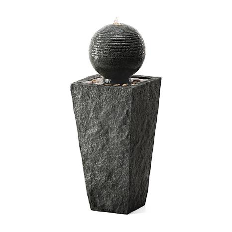 Enhance your outdoor space with this modern minimalist pedestal and sphere geometric design, featuring a faux stone texture that adds a touch of artistic and natural beauty. Water gently bubbles up from the top, gliding over the surface of the orb, and then spills into the pebble-adorned pool below, the soothing sound of cascading water helps to create a relaxing and meditative atmosphere. With an LED light above the sphere, the trickling water ripples and sparkles in the warm glow, adding visual interest that is sure to transform your garden, patio, or backyard into a tranquil, charming, and delightful environment.Crafted from high-quality polyresin and stone powder with hand painted finish, it is sturdy and durable. A convenient power cord and pump are included, simply add water, plug in and enjoy.