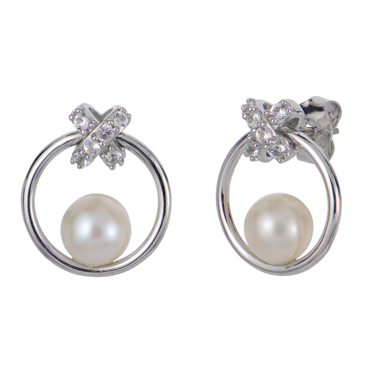 Pavé-set created white sapphires encrust the bow that forms this stud earring's pearl-accented loop. Sweet and nostalgic, it's a piece that's perfect for classic tastes.