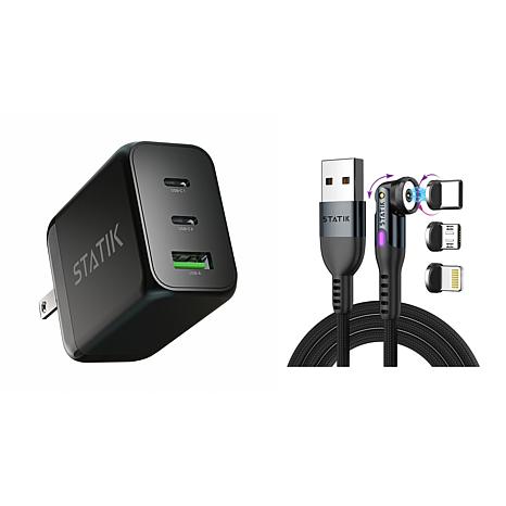 Power up efficiently with the 65W GaN Power Adapter and Statik 360 Universal Charge Cable combo. The 65W GaN Power Adapter delivers rapid, high efficiency charging in a compact, heat-resistant design. Pair it with the Statik 360 Universal Charge Cable, which features a versatile 360-degree rotating connector, and this set ensures seamless connectivity and convenience for all your devices. It's perfect for home, office, or travel, and offers reliable performance and flexibility to keep your gadgets powered up with ease. Power up three devices simultaneously with the 3-in-1 GaN Adapter. Fifty-one percent smaller and quicker thanks to advanced GaN technology. Universal 100-240V power; no voltage converter needed abroad. It prevents overheating and overcharging, protecting your devices. It's compact and foldable for easy travel. Charges laptops, phones, and more, fully charging a MacBook Pro 13” in 2 hours.
