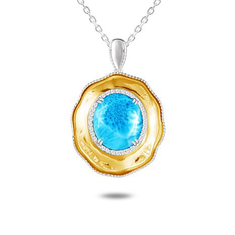 A sunny halo emanates from the topaz-trimmed ocean of larimar centered on this design: your island paradise in a pendant.