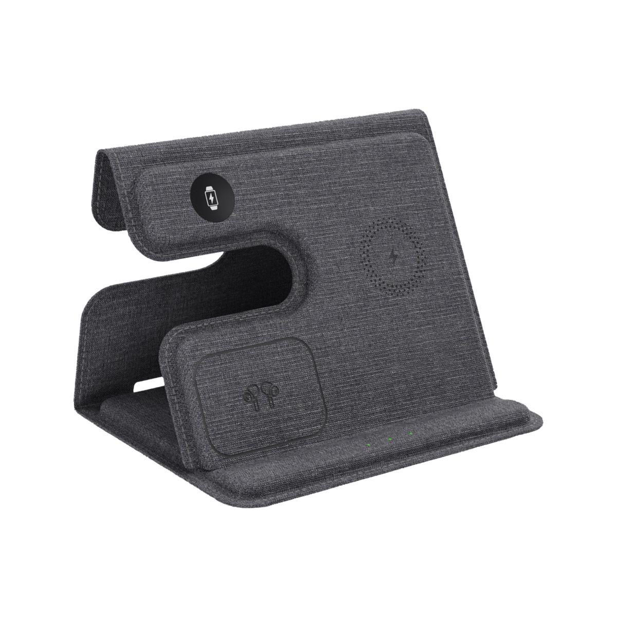 This 3-in-1 Foldable 18W Wireless Charging Station is elegantly crafted from PU fabric, ABS metal, wrapped in premium leather & designed to seamlessly charge multiple devices at the same time including iPhone, AirPods, and iWatch or other wireless cell phones and ear buds. The minimalist design requires just 1 USB Type-C plug, saves space and is both lightweight and foldable.