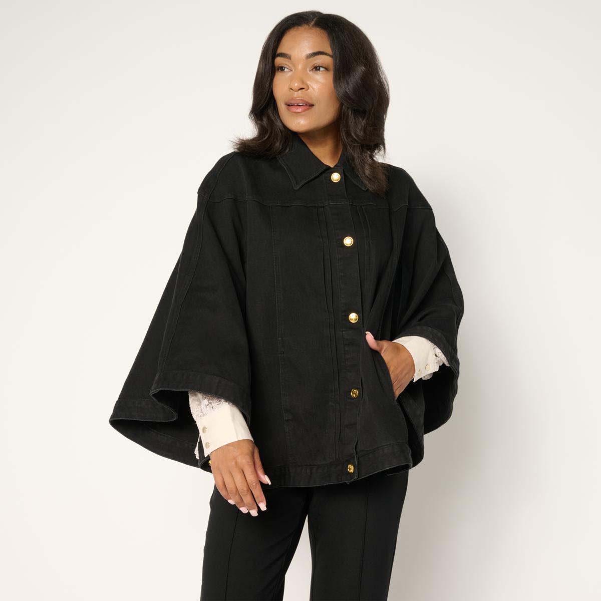 Comfort, couture and warmth. This button-down denim poncho pairs perfectly with skinny jeans and leggings alike.