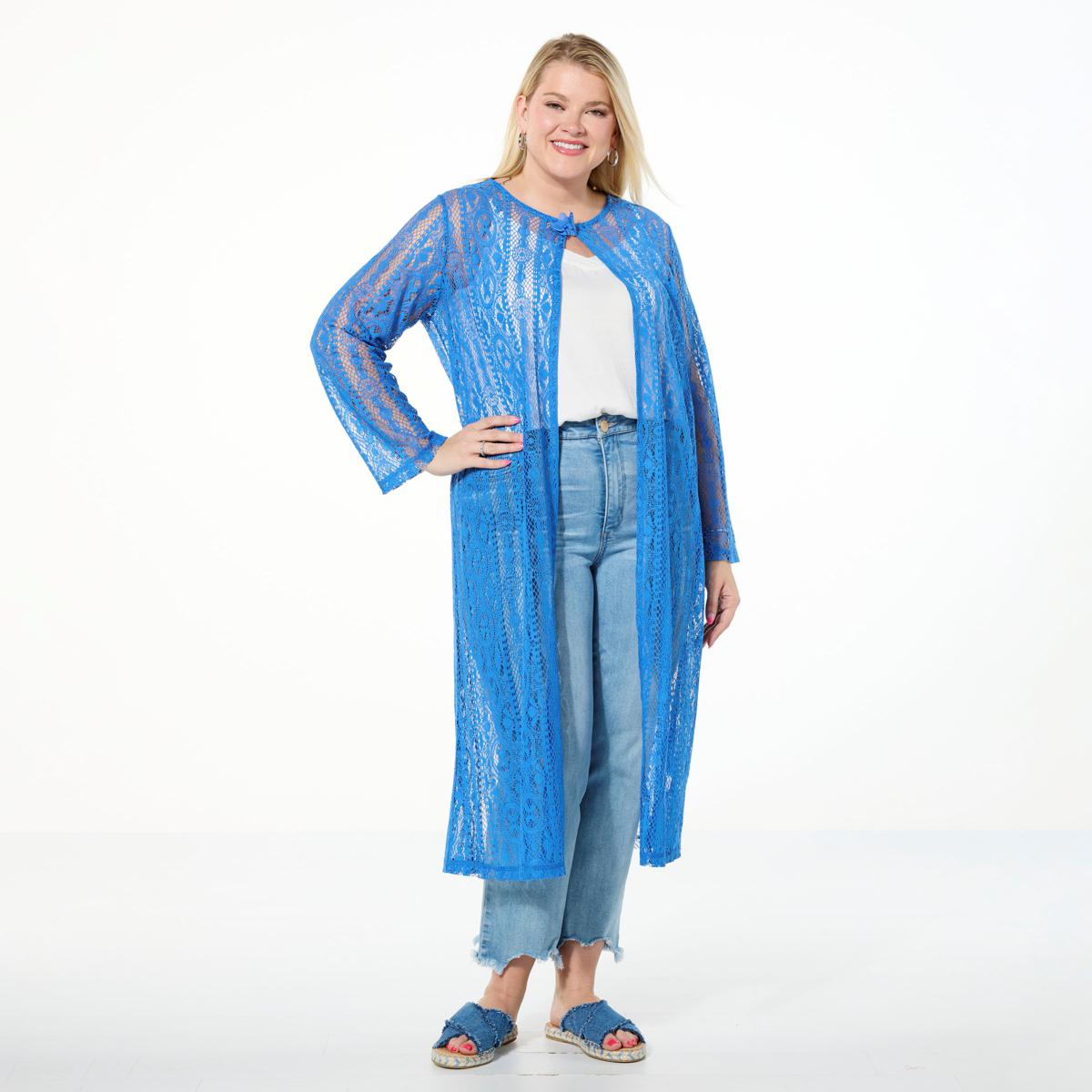 Layered over your easiest outfits, this crocheted duster adds an extra layer of style with its pretty floral lace patterns. A single hook-and-eye clasp at the neckline is hidden behind a delicate lace flower so your final layer sits securely fastened, yet still lets your best top and pant ensemble or favorite sundress peek out from underneath.