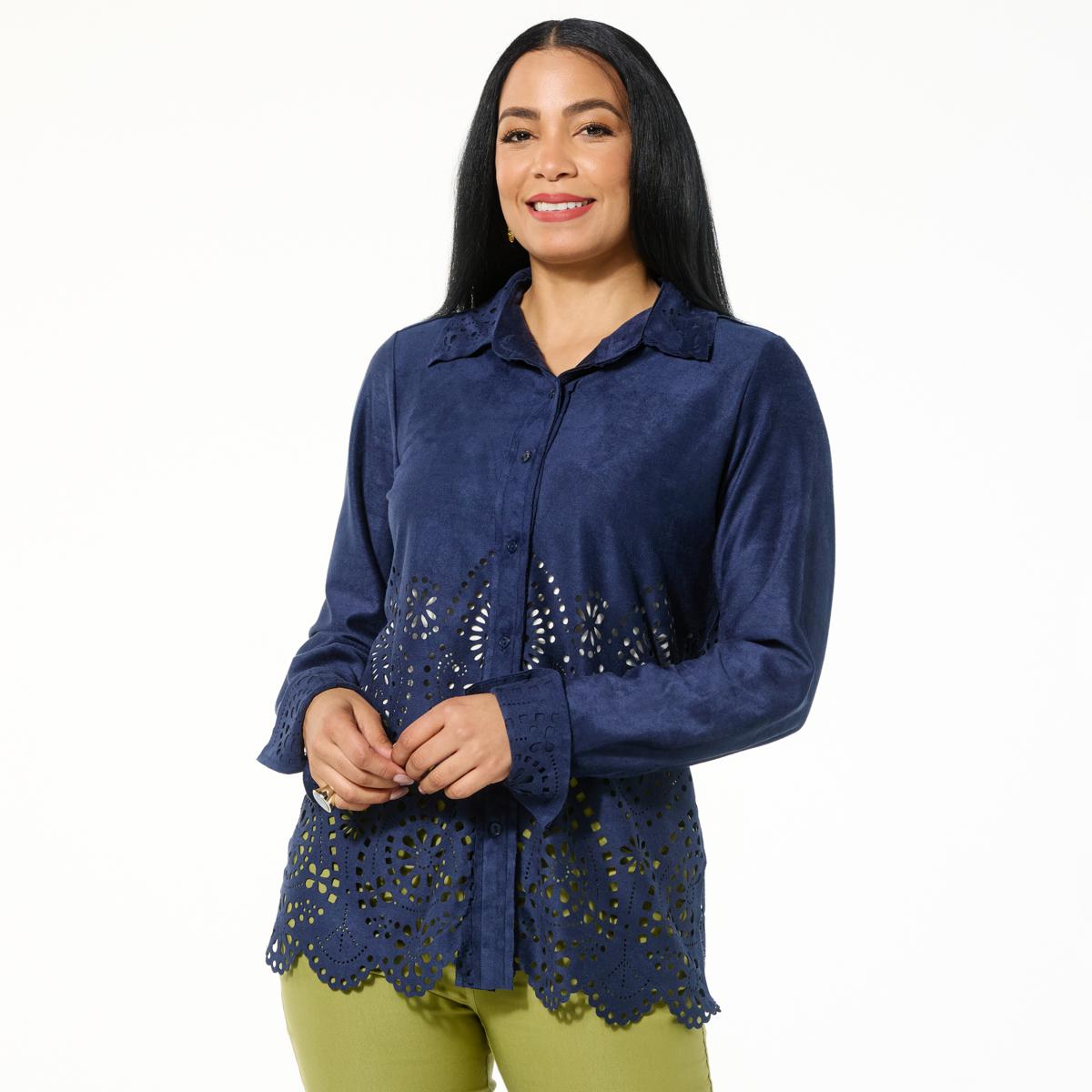 Put a little giddy-up in your getup with this button-down shirt from Antthony. Soft and stretchy faux suede fabric is adorned with intricate laser-cut patterns and a scalloped hem to effortlessly blend the best of timeless Western style with contemporary everyday fashion, creating a versatile statement for any occasion. Yee-haw!