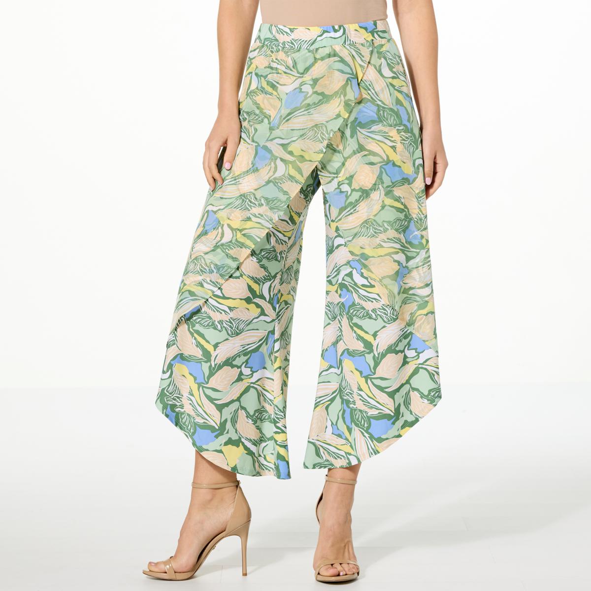 These printed wrap-front pants with a chiffon overlay are a stylish way to work a statement look into your fashionable lifestyle by offering effortless elegance.