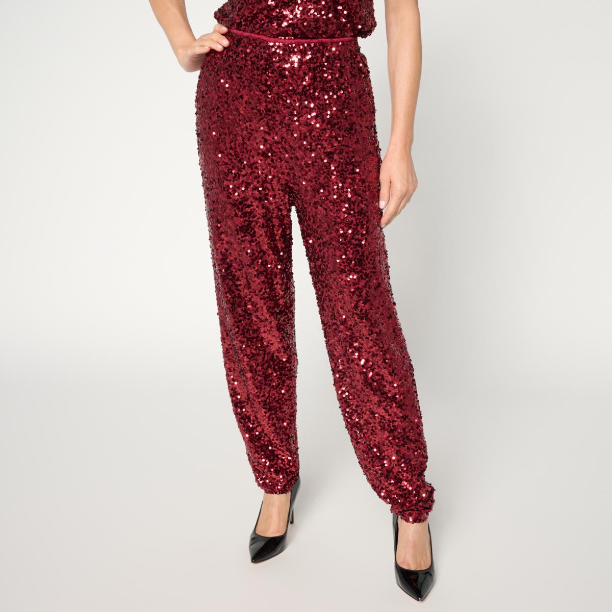 Step into the spotlight with these dazzling sequin harem pants that bring effortless glam to your wardrobe. Fully lined and featuring an all-around elastic waist, they offer comfort without compromising style. Perfect for holiday parties or any occasion where you want to shine, these pants pair beautifully with your favorite tops and heels.