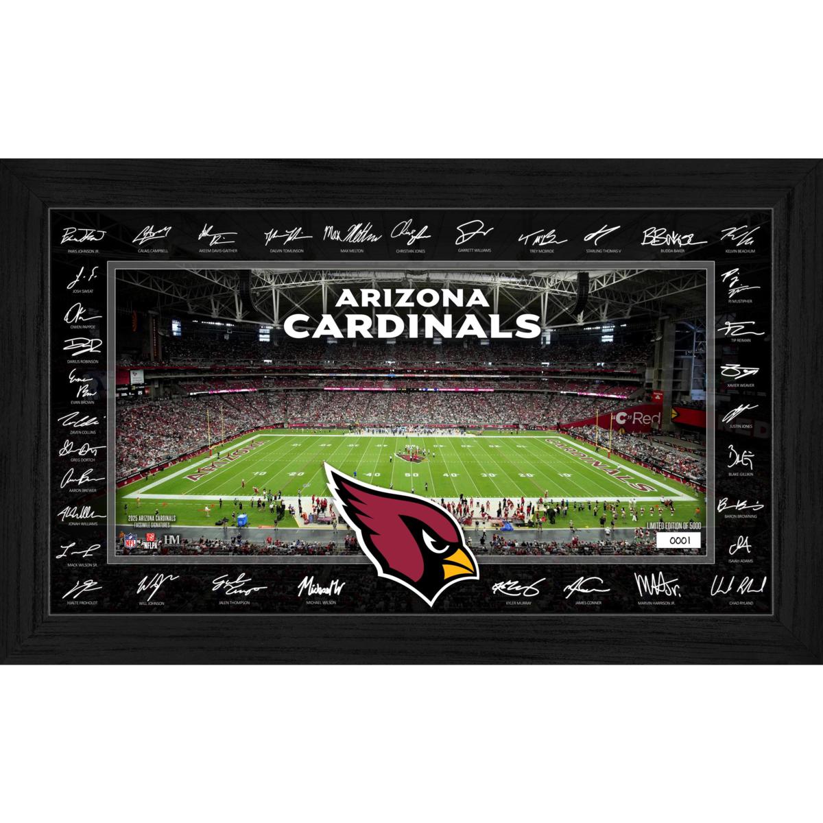 Signature Gridiron frame showcases an individually hand-numbered print of the Arizona Cardinals home field, surrounded by the facsimile (replica) signatures of most of the 2025 team roster. Elegantly presented under acrylic glass, this officially licensed collectible is a limited edition of only 5,000 — each accompanied by a certificate of authenticity.