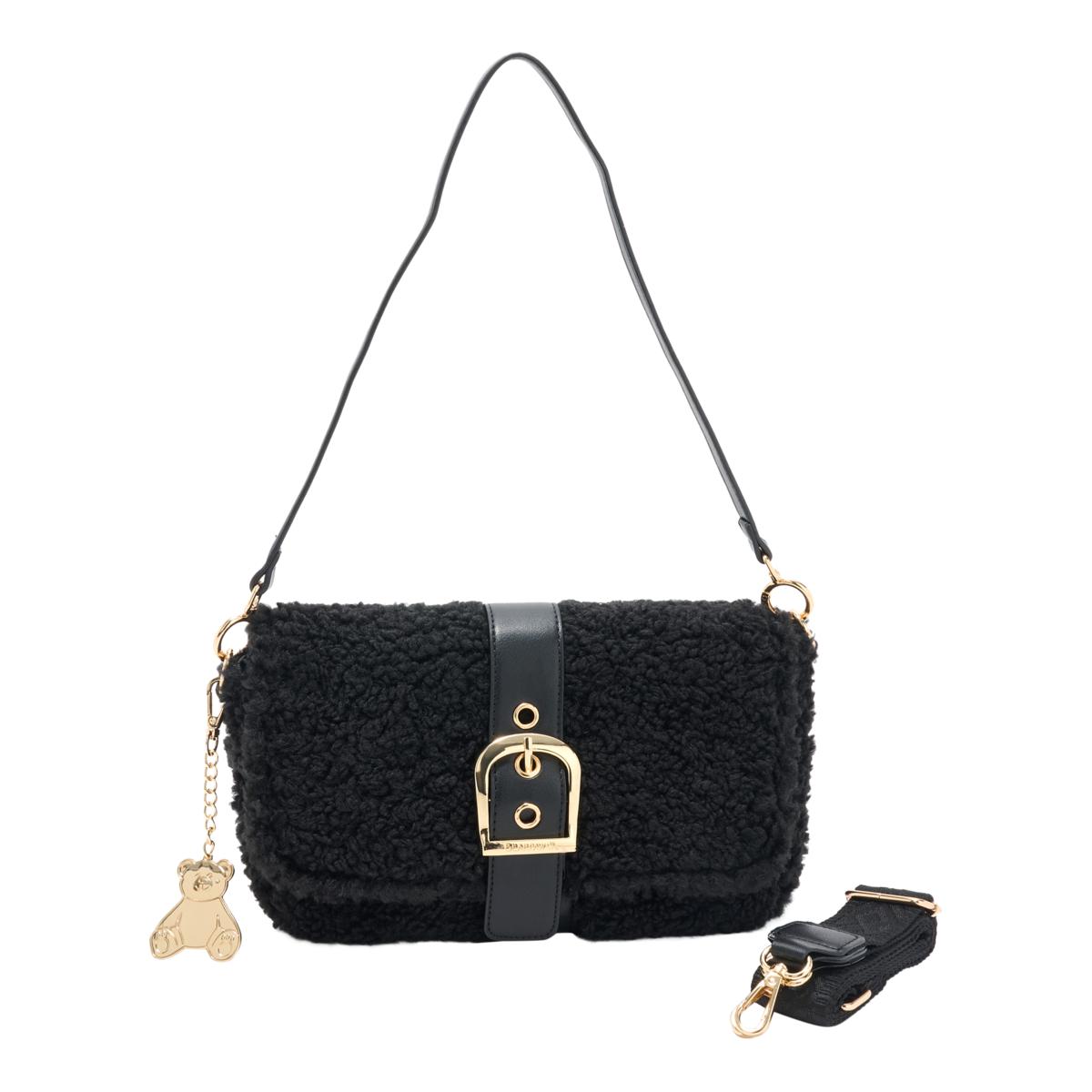 Cozy meets cool with this sherpa crossbody that adds a plush texture to your everyday look. The bold belt buckle flap closure and detachable strap let you switch from hands-free to chic clutch in seconds. Keep essentials close with a hidden back pocket and enjoy a playful touch with the signature metal bear keychain.