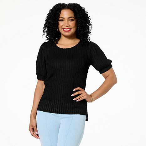 With the prettiest puff sleeves and a clean crew neck, this textured crepe knit top is a flattering and comfy kind of polish for every day.