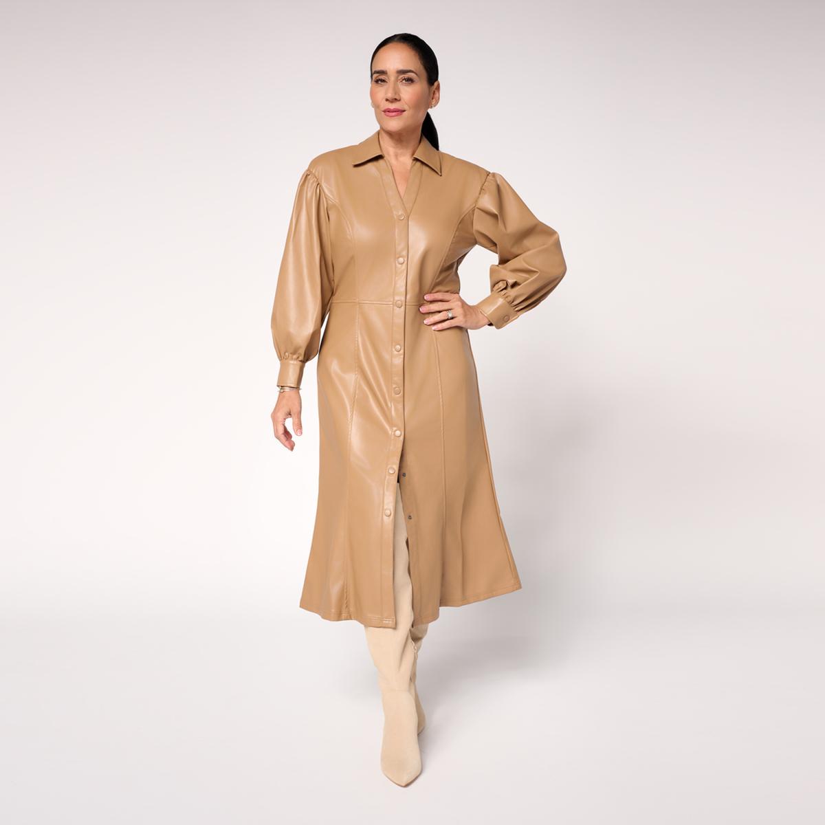 So buttery-soft, you won't believe it's faux! We took the classic shirtdress to edgy new heights in sophisticated faux-leather fabric and then added a big dose of fierce femininity with poufy, full blouson sleeves and princess seams that lead into an inverted pleat at the hem. Striking the perfect balance between tailored and effortlessly cool, this midi-length must-have is a match for both the workday and for after-hours plans.