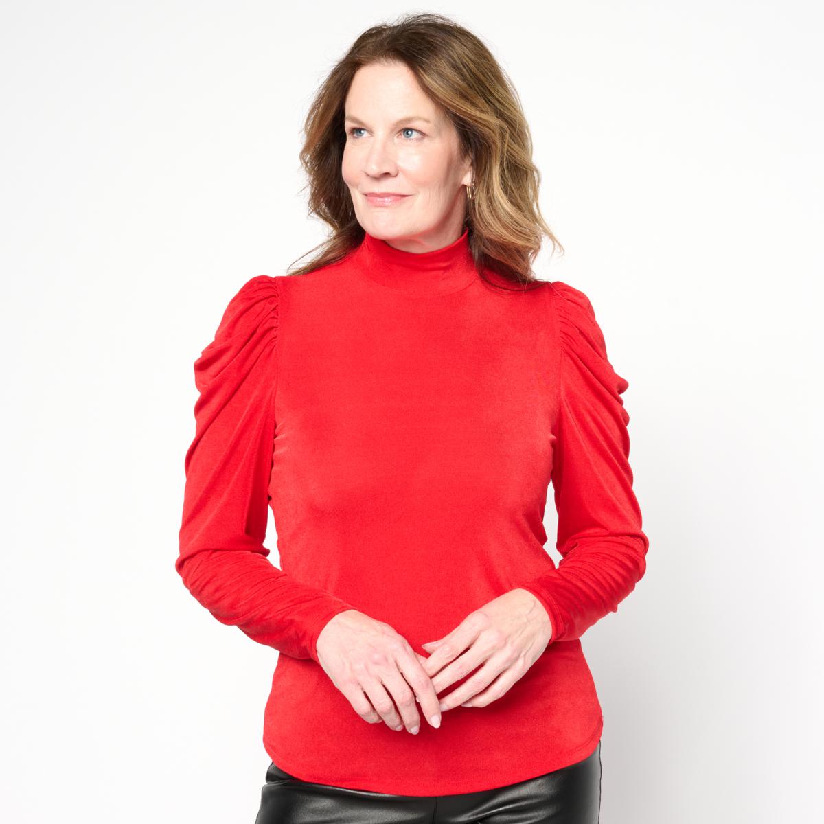 This semi-fitted mock neck top features charming, shirred puff sleeves that add a touch of elegance to your look. Perfect for layering or wearing on its own, it offers a flattering silhouette with comfortable stretch. Dress it up or down for versatile style that moves with you.