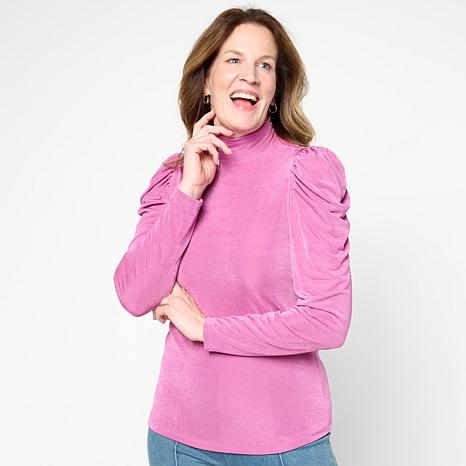 This semi-fitted mock neck top features charming, shirred puff sleeves that add a touch of elegance to your look. Perfect for layering or wearing on its own, it offers a flattering silhouette with comfortable stretch. Dress it up or down for versatile style that moves with you.