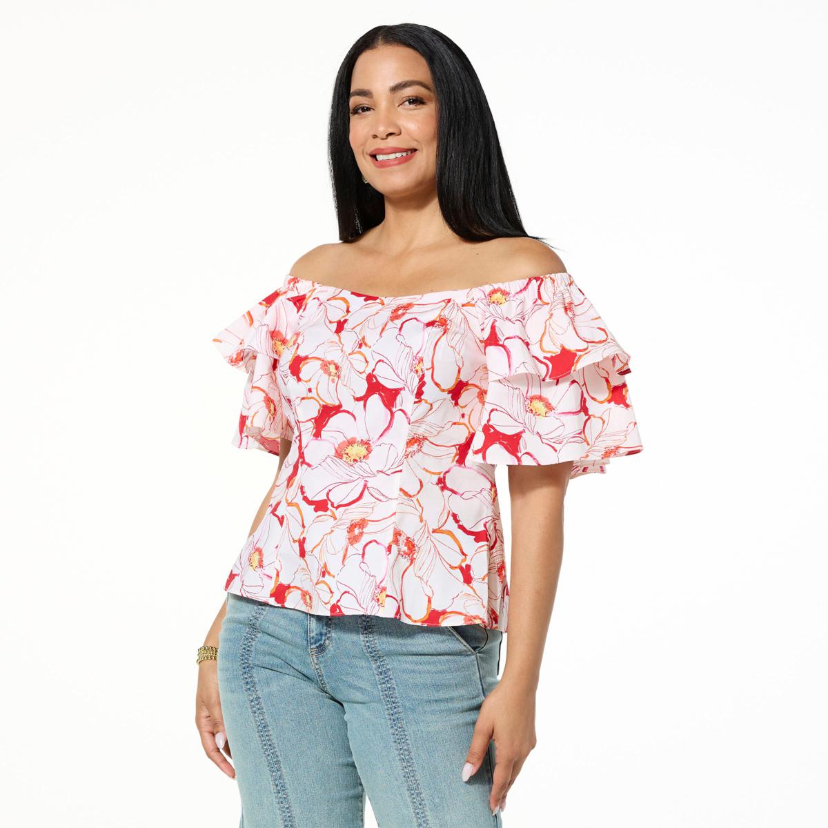 What better way to show off your feminine side than with this soft cotton poplin knit top, featuring an off-the-shoulder neckline, layered sleeves and ruffle detail?