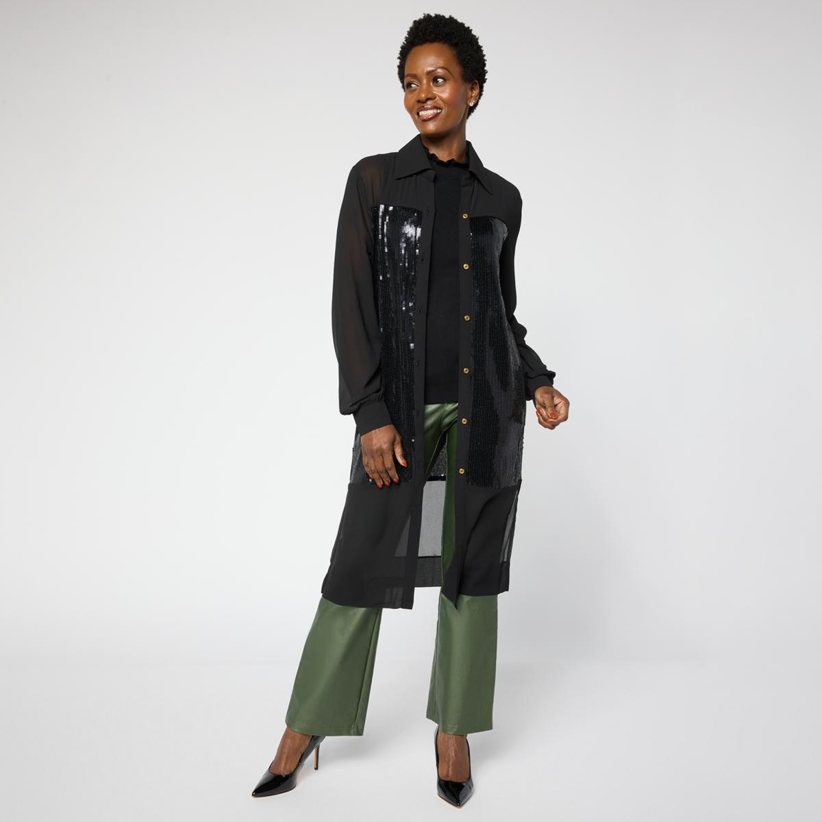 This long tunic silhouette features a button-front closure and set-in sleeves with fullness at the cuff for a flattering fit. The sequin fabric panel adds a touch of sparkle, perfect for holiday gatherings or evening outings. Pair it with your favorite leggings or slim pants for an effortlessly chic look.
