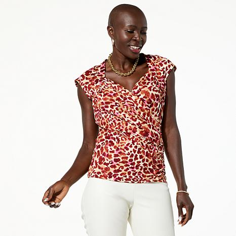 What better way to show off your feminine side than with this soft jersey knit top, featuring shirred cap sleeves, a surplice wrap neckline and bright, bold colors?