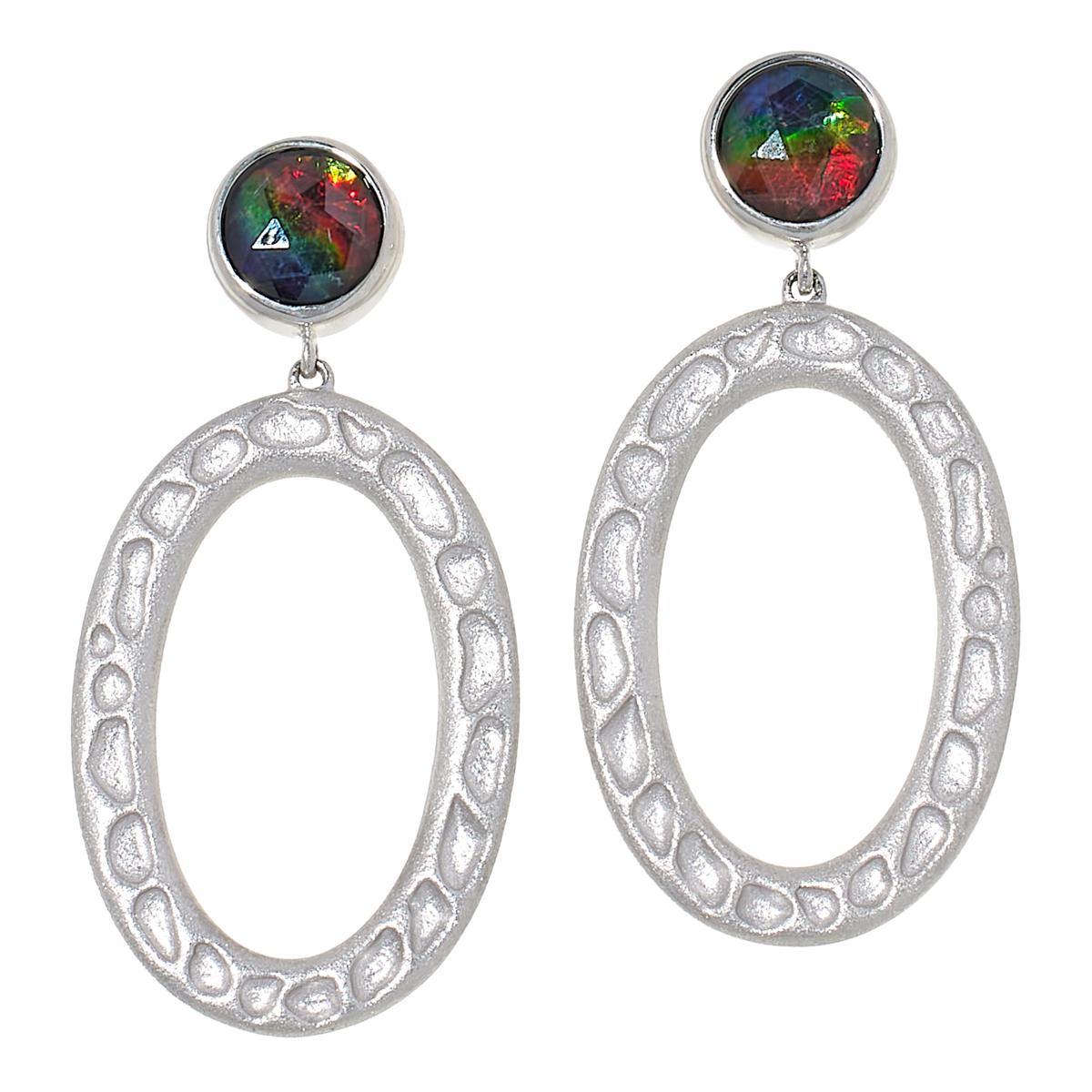 For a touch of the dramatic, slip on these pretty drop earrings. They feature rainbow-colored ammolite, a rare gem from Alberta, Canada, capped with faceted clear quartz on post fronts and paired with textured, silver oval drops. By Kenneth Bradley.