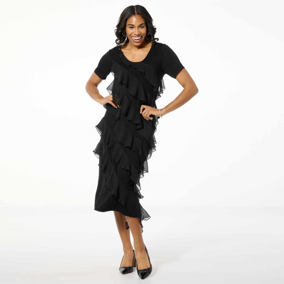 Style that stops the show. The flattering ruffled tier detail of this short sleeve knit dress highlights your best assets without sacrificing comfort.