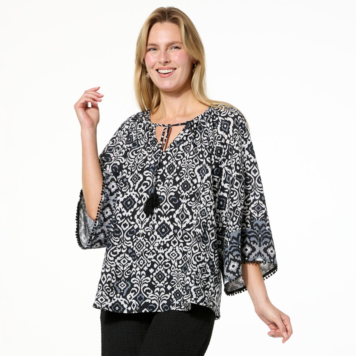 The loose-fit silhouette, tassel drawstring ties at the neckline, and billowy raglan sleeves with crocheted trim bring a breezy vibe to this Boho-inspired top. A pretty, playful print enhances the laid-back look that pairs seamlessly with denim for an even more free-spirited flair.