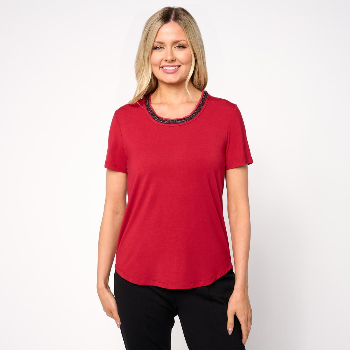 Life can always use a little more sparkle! An embellished neckline adds a flirty, shimmery finish to this classic everyday short-sleeve tee from Diane Gilman.