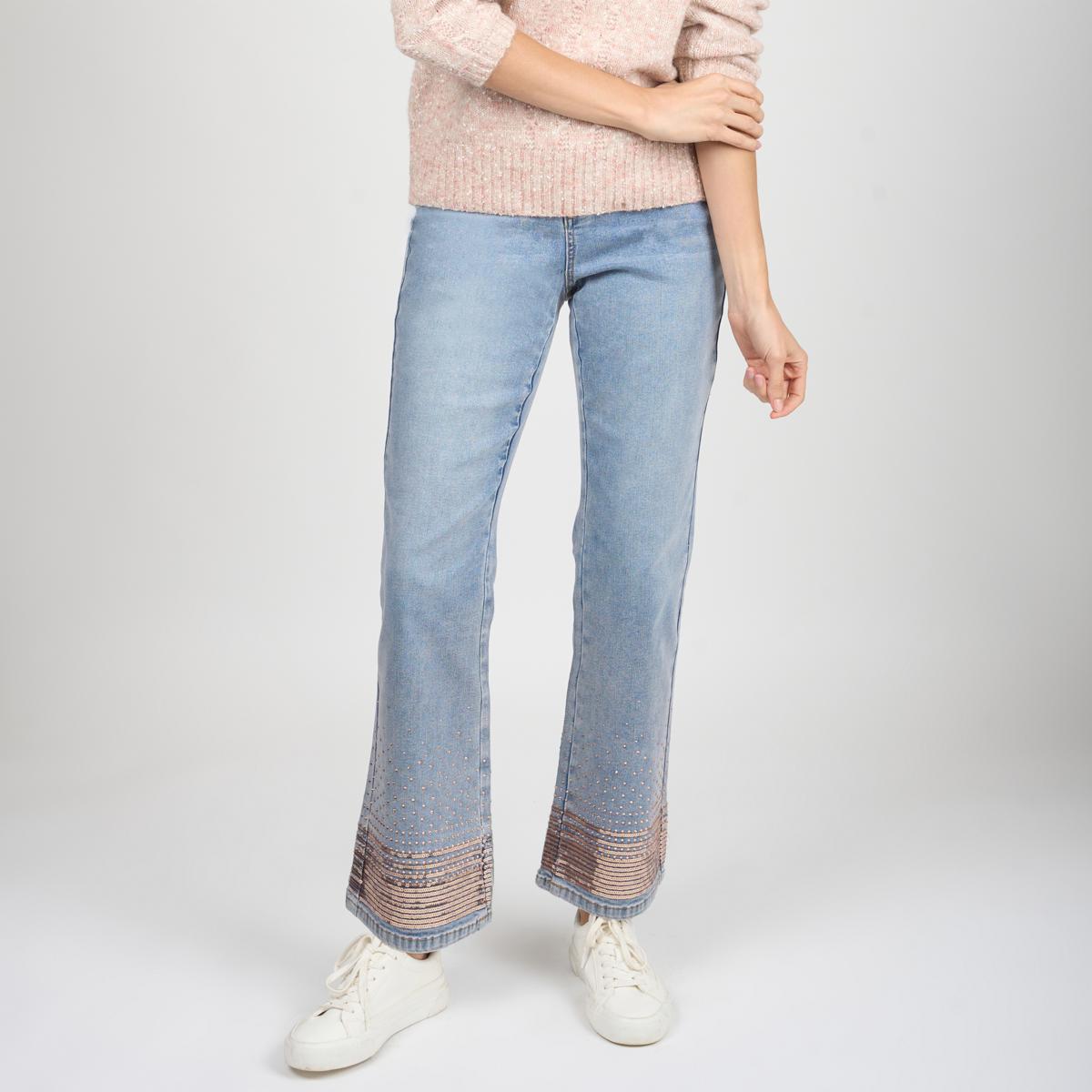Step out in style with these bootcut jeans featuring dazzling sequin embellishments at the leg openings. Crafted for comfort and a flattering fit, they pair perfectly with your favorite tops for day-to-night wear. Whether dressing up or down, these jeans add a touch of sparkle to your wardrobe.