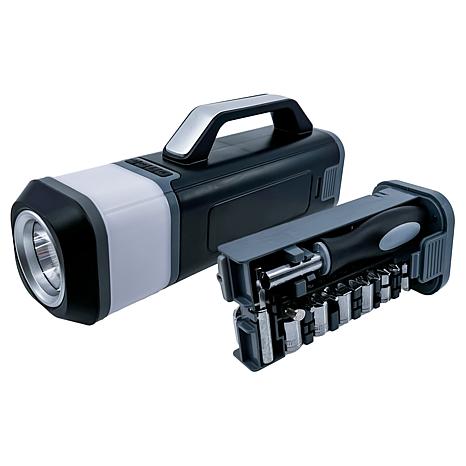 With this flashlight and lantern toolset you get one device with unlimited readiness when darkness falls, the power is out, or emergencies strike. This handy multi-purpose light transforms from an adjustable high-beam/low-beam flashlight to an ambient 360 degree multi-color lantern or signal light with the push of a button. But that's just the beginning - a quick simultaneous press-and-pull reveals a comprehensive tool set containing most of the tools needed for everyday repairs, integrated seamlessly into its unique design.
