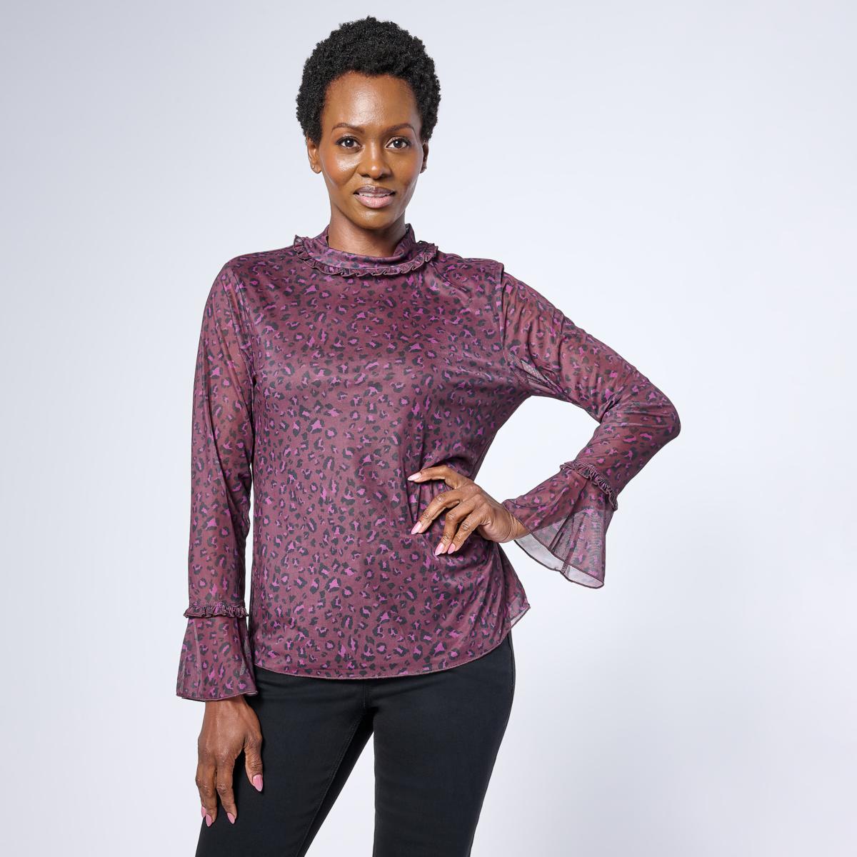 Classically chic and alluring, this animal-print mesh knit top (with flounce sleeves) adds an exotic elegance to your look.