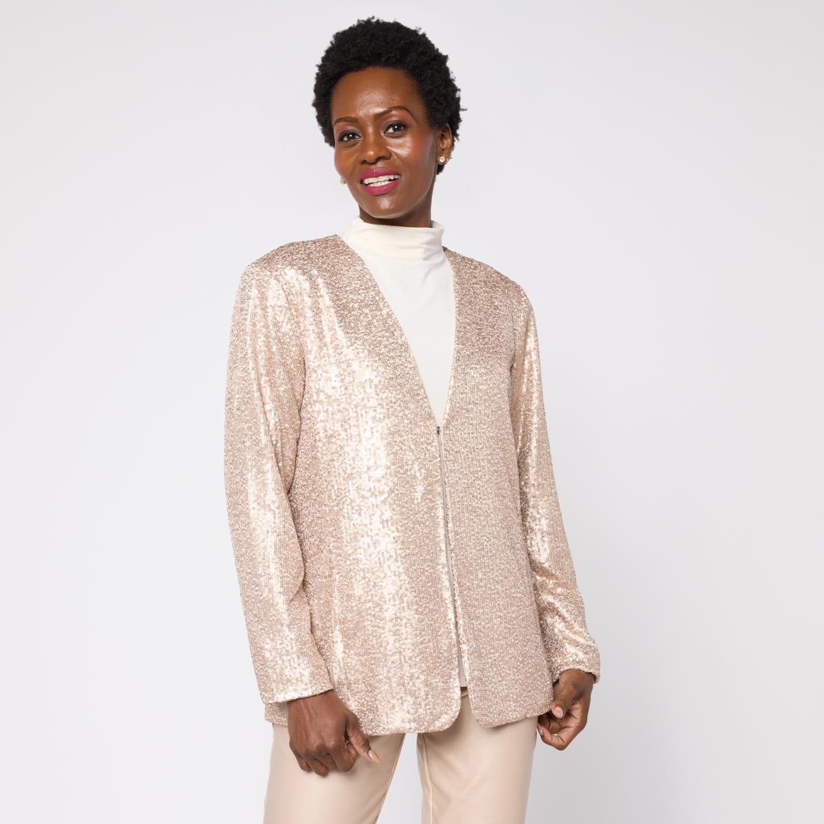 Elevate your evening look with this stunning sequin cardigan featuring a sleek collarless design and front kissing hook-and-eye closure. The fully lined interior and on-seam pockets add comfort and practicality, while the long, two-piece sleeves offer a polished finish. Perfect for holiday parties or special occasions, this cardigan brings sparkle and sophistication to your wardrobe.