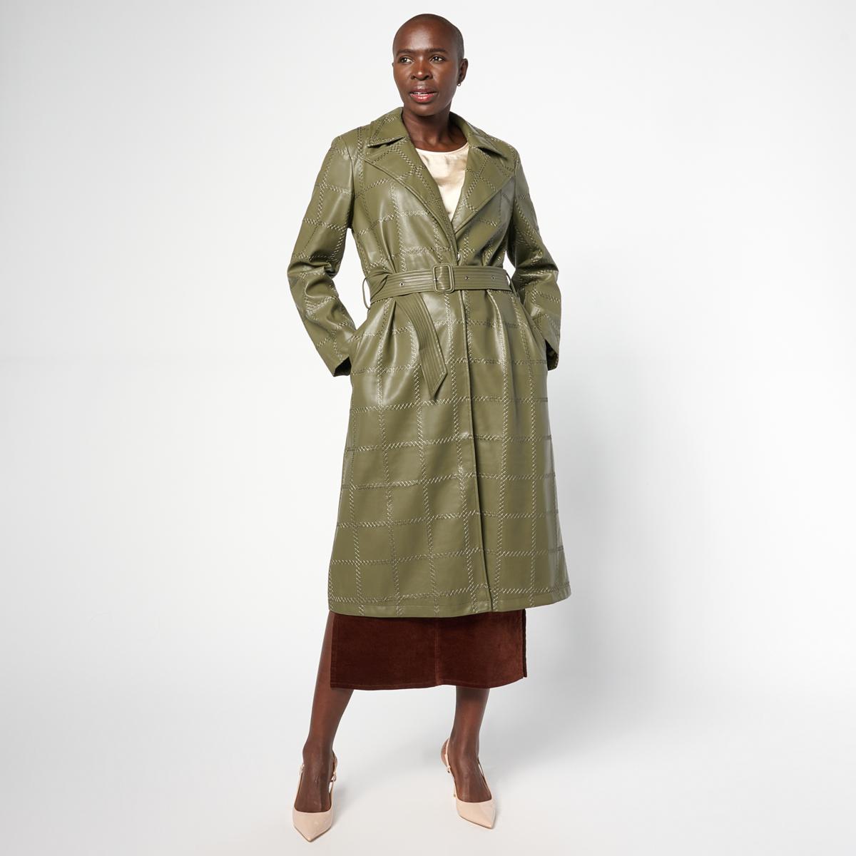 This sleek trench coat features a modern grid-stitching design and an adjustable belt with grommets and a buckle for a perfect fit. The notched collar adds a classic touch, while the sideseam pockets and center back vent offer practicality and style. Layer it over your favorite outfits for a polished look that transitions effortlessly from day to night.