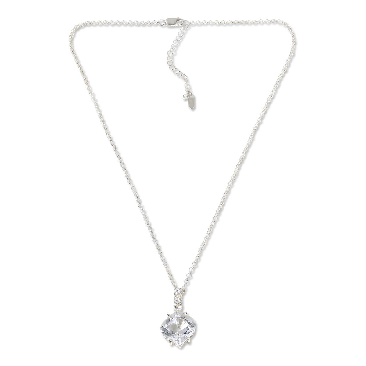 - Pendant has single, prong-set Rhozen (Rhombus-shape) cut Herkimer quartz stone