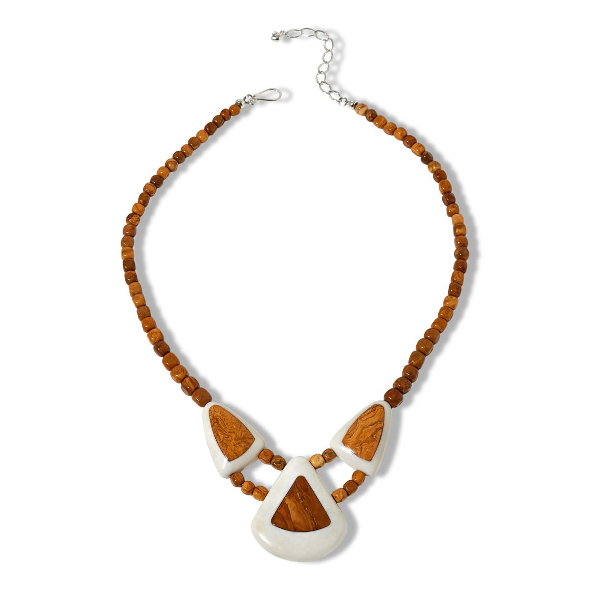 - Necklace drape comprised of three triangular white calcite stones with inlaid triangles of multicolor brown and tan chalcedony in quartz