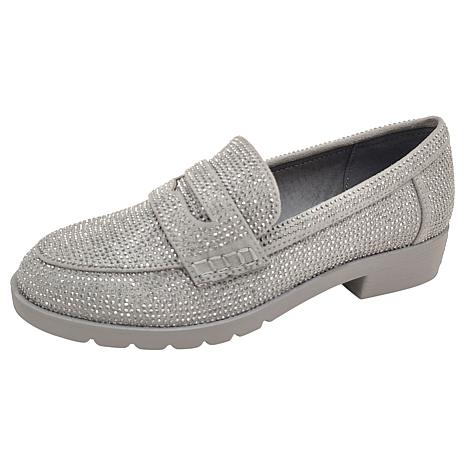 A perfect mash up of classic meets sparkly, this stunning (and sparkly) version of the classic penny loafer is a quintessential fashion fall look with jeweled vamp details and a cushioned footbed.