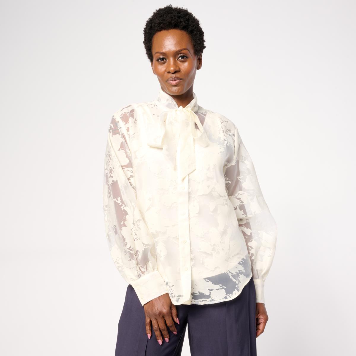 This elegant blouse features a charming bow neck and long sleeves with buttoned cuffs, perfect for adding a touch of sophistication to your wardrobe. The attached scoop-neck tank provides comfortable layering, making it ideal for both workdays and special occasions. Its hi-low shirt tail hem offers a flattering silhouette that pairs beautifully with your favorite bottoms.