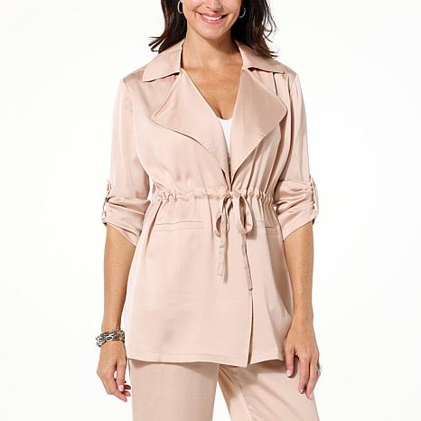 Fresh and functional, this hammered satin jacket provides a flattering fit with its drawstring-waist design and welt pockets. The long tabbed sleeves allow you the fashion freedom to wear up or down, creating a variety of looks that satisfy your fashion appetite.