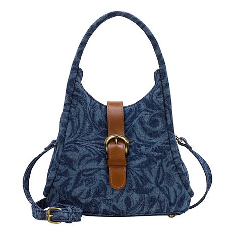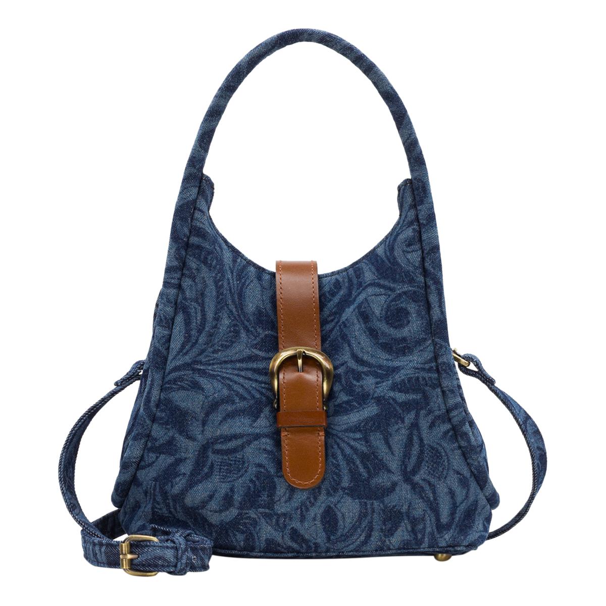 Patricia took her stunning Cavo Tooled design and reimagined it on denim. The Halina features a beautifully rounded shape, complemented by pretty top handles and an adjustable/detachable crossbody strap for easy wear. The leather strap-over closure, adorned with a decorative buckle, adds a touch of elegance to its understated look.