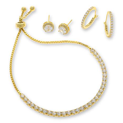 A coordinated look is so easy to pull together with this matching line bracelet, hugger hoop and halo earring set. Wear the pieces solo or stack, layer and match them with other jewelry. The bracelet even features a bolo design you can adjust to fit your wrist and style.