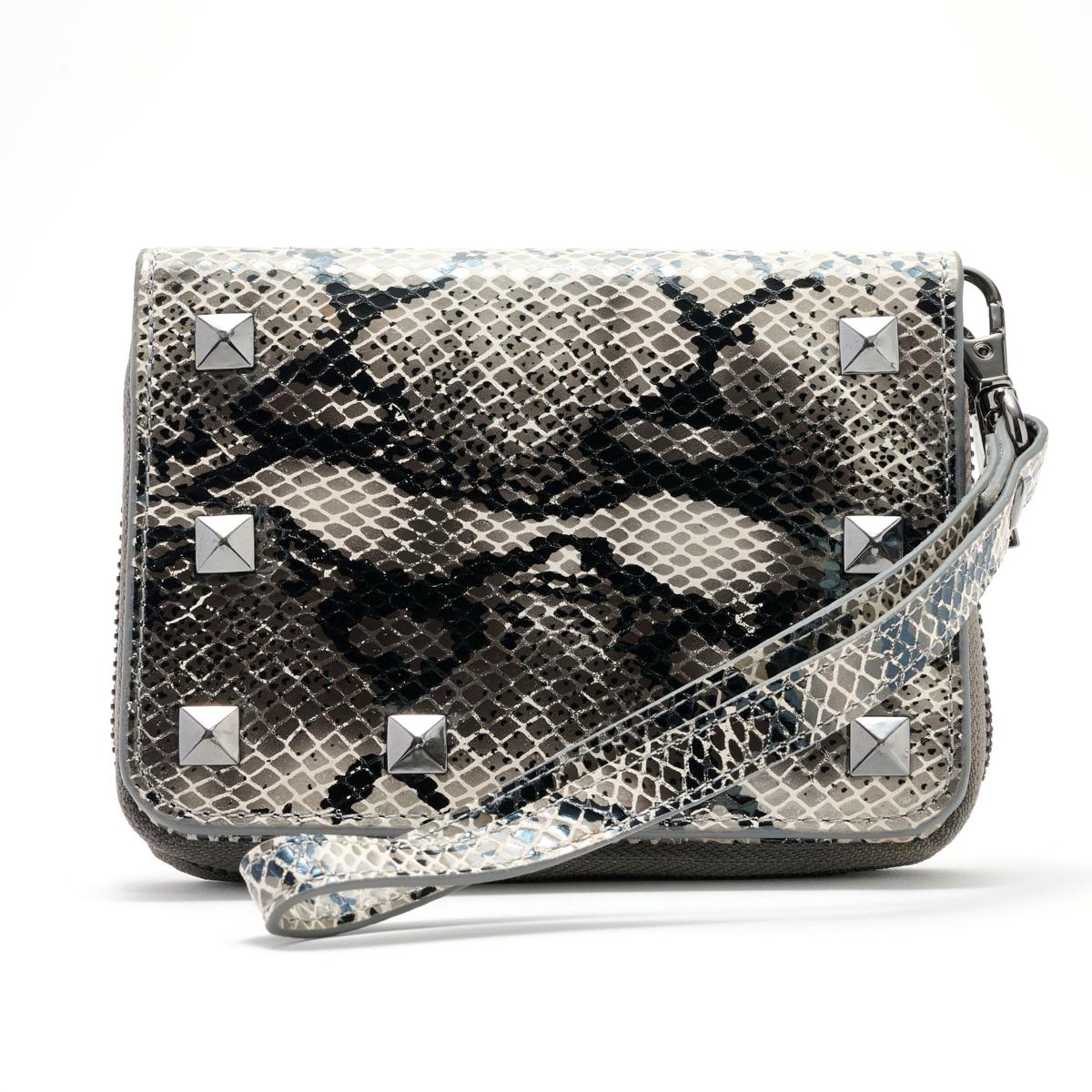Convenient for storing in most sizable bags, it features plentiful pockets and a detachable wristlet strap for organization and versatility.