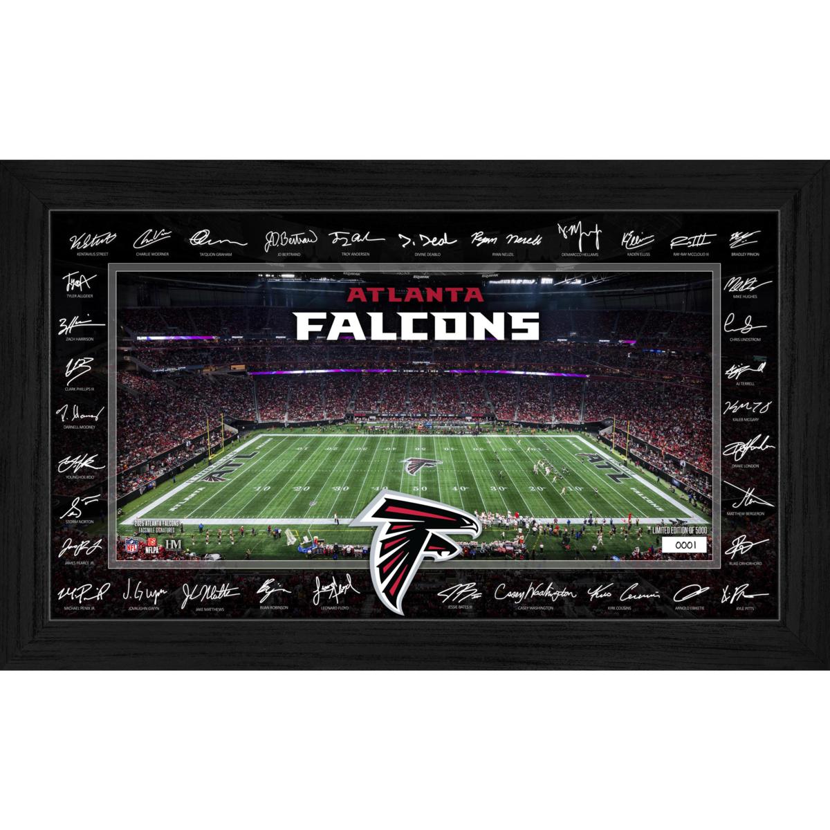 Signature Gridiron frame showcases an individually hand-numbered print of the Atlanta Falcons home field, surrounded by the facsimile (replica) signatures of most of the 2025 team roster. Elegantly presented under acrylic glass, this officially licensed collectible is a limited edition of only 5,000 — each accompanied by a certificate of authenticity.