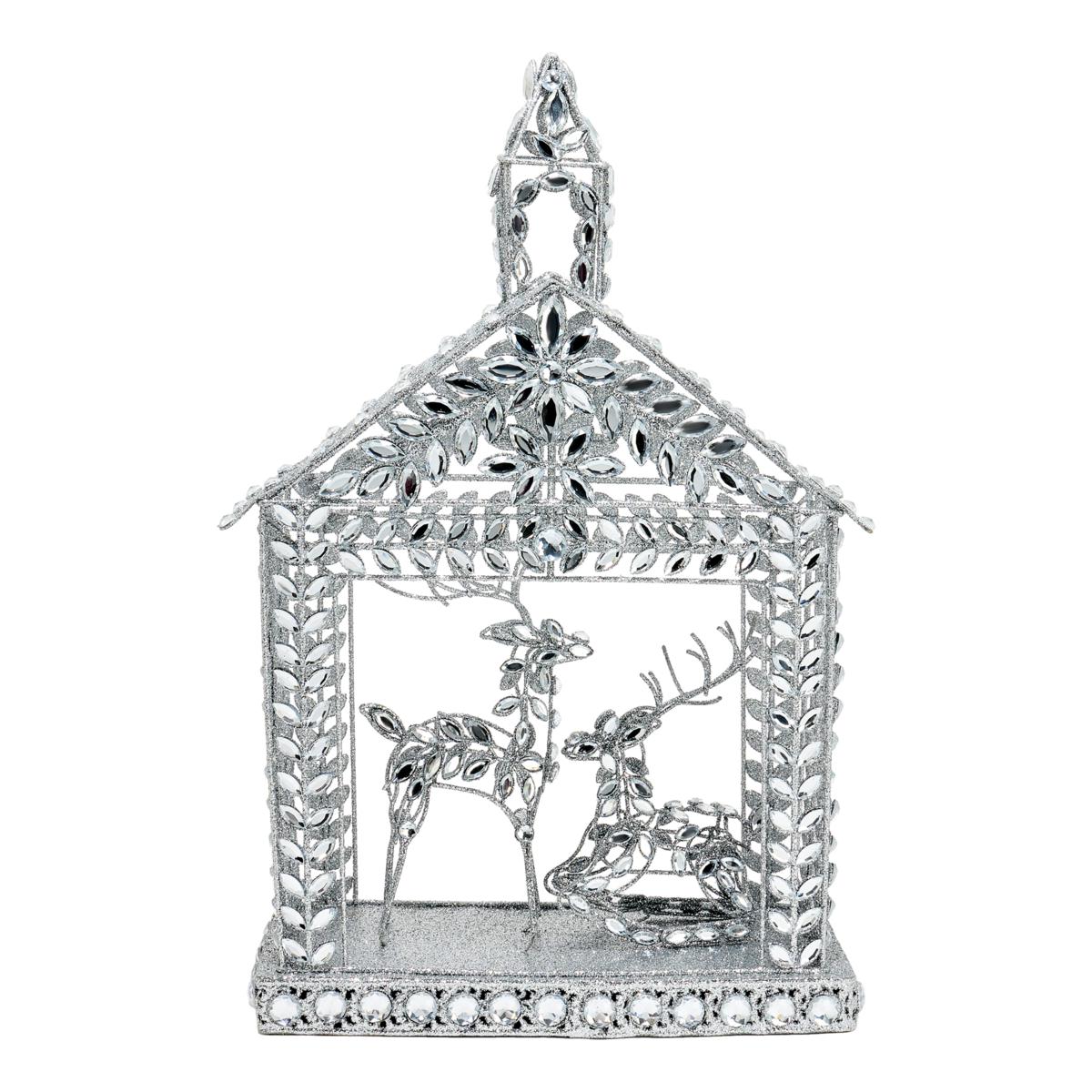 Add a touch of holiday magic to your decor with the august & leo 17" Jeweled Glitter Stable with 2 Jeweled Deer, a breathtaking centerpiece that brings sparkle and sophistication to any festive display. Handcrafted with 550 dazzling acrylic jewels, this ornate stable and its graceful deer duo shimmer in your choice of champagne or silver, casting radiant reflections that elevate your seasonal styling. Measuring 17" tall, the intricate faceted gems catch the light from every angle, creating an eye-catching display of glamour and opulence perfect for mantels, tabletops, or as part of your Christmas village. Designed for indoor use and easy to clean with a soft cloth, this handmade treasure blends timeless elegance with festive charm for a truly enchanting holiday aesthetic.