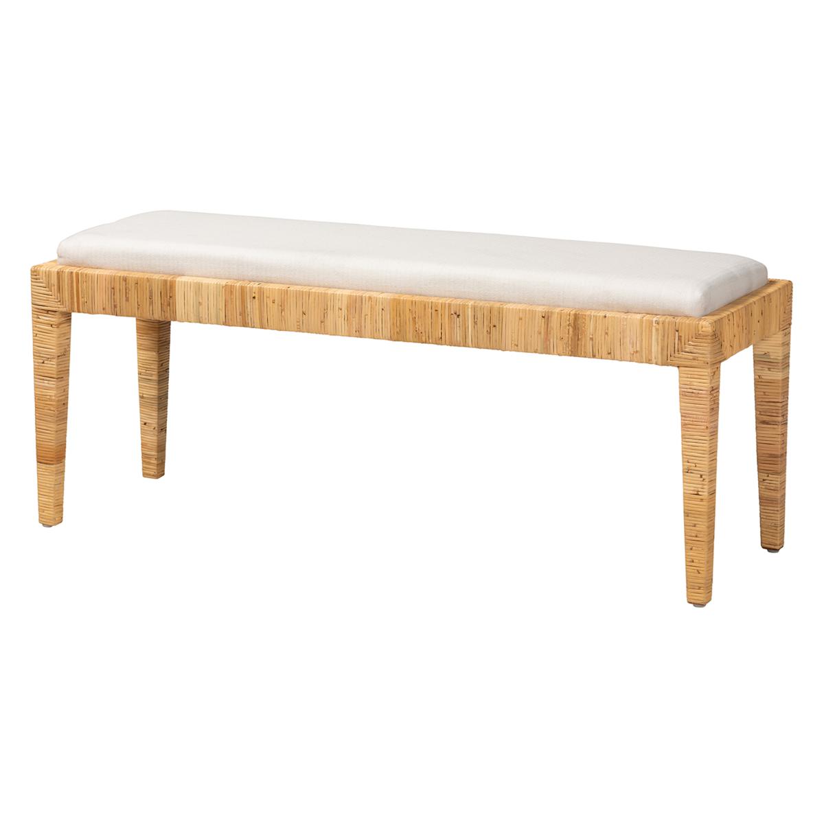 Elevate your space with the relaxed tropical vibe of the Sofia bench. Handmade in Indonesia, this chic piece features a solid mahogany wood frame wrapped in natural rattan, offering a cozy padded seat upholstered in soft fabric. Its tapered legs add a modern touch, making it a perfect blend of bohemian flair and contemporary style.