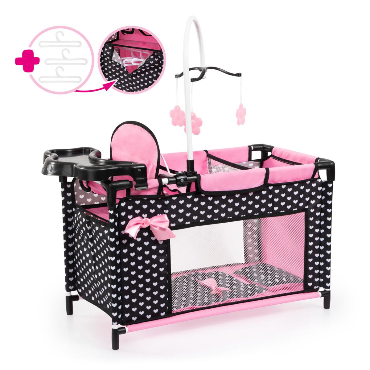 Bayer Multi-Level Mesh Doll Bed, Changing & Feeding Station - Black/Pink/Hearts