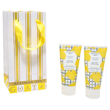This 2-piece set includes two 2 oz. tubes of moisturizing hand cream, formulated with vitamin-rich goat milk and scented with the fresh Sunshine Lemon fragrance. Packaged in a lovely gift bag, it's the perfect, pampering gift for someone special.
