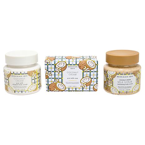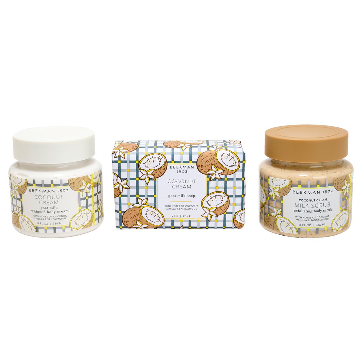 Treat your body to the most luxurious body care experience with this trio from Beekman 1802. Featuring a 9-ounce triple-milled Bar Soap, an 8-ounce oat and goat Milk Scrub for Body, and an 8-ounce Whipped Body Cream, all fortified with vitamin-rich goat milk and key botanicals and fragranced with the light scent of Coconut Cream. With this sumptuously scented trio, you can bring home everything you need to cleanse, polish, and nourish your skin with goat milk moisture.